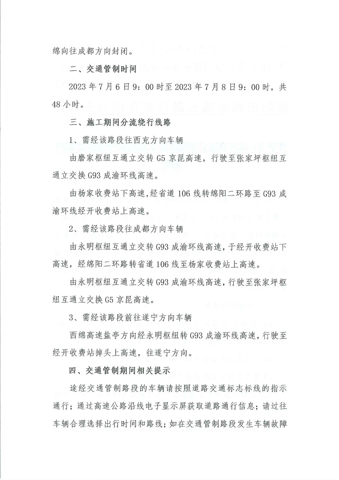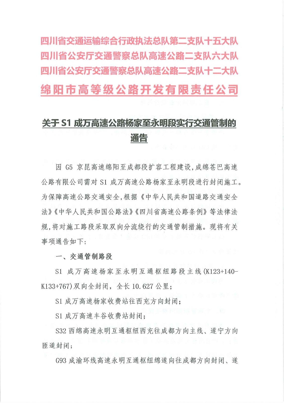 關于S1成萬高速公路楊家至永明段實行交通管制的通告