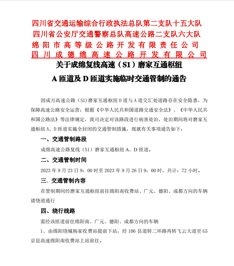 關(guān)于成綿復(fù)線高速(S1)磨家互通樞紐A匝道及D匝道實施臨時交通管制的通告